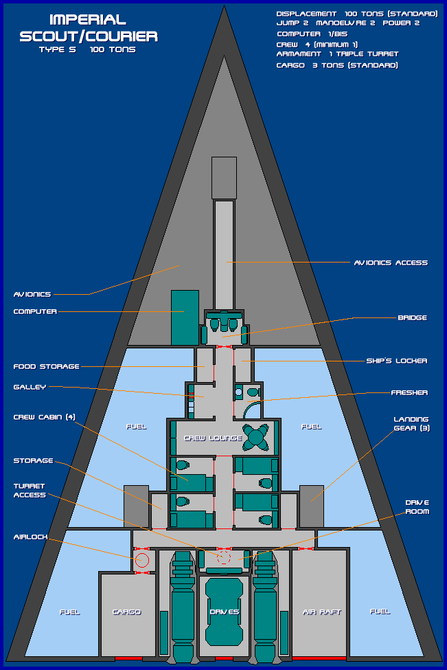 The ubiquitous 100 ton Type S Scout is the single most common starship plying the spacelanes. Thousands of these vessels are assigned to reserve scouts, and many more have passed into private hands. The deck layout shown is representative of the base model, but most privately owned 100 ton Scouts have been remodelled by their owners.